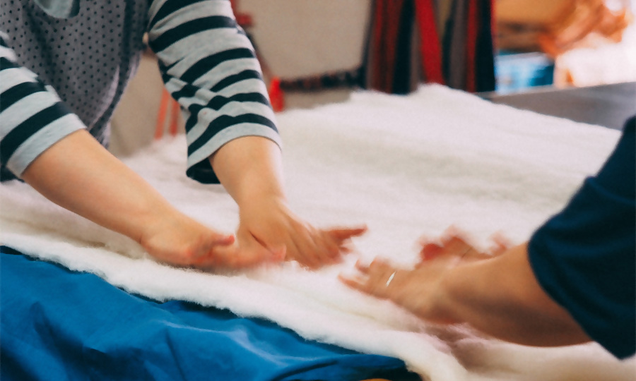 そして、最終的に協業先として決定した宮田織物株式会社は、筑後市に本社を置く創業112年の老舗ものづくり企業。一本の糸を選ぶことから始め、デザイン、織り、裁断、縫製まで自社一貫生産で、見えない所も決して手を抜かない誠実なものづくりが同社の強み。同社の経営理念である「一隅を照らす」は、「誰一人取り残さない」というSDGsの理念にも通ずるものです。筑後地域の伝統産業として地域とともに発展を続けながら、主力商品である「わた入れはんてん」は、県内外の多くのユーザーから好評を博してきました。近年では、人々のライフスタイルの変化に対応した新商品の開発のほか、福岡市内の直営店やオンラインショップでの魅力発信や販路拡大にも積極的に取り組んでいます。