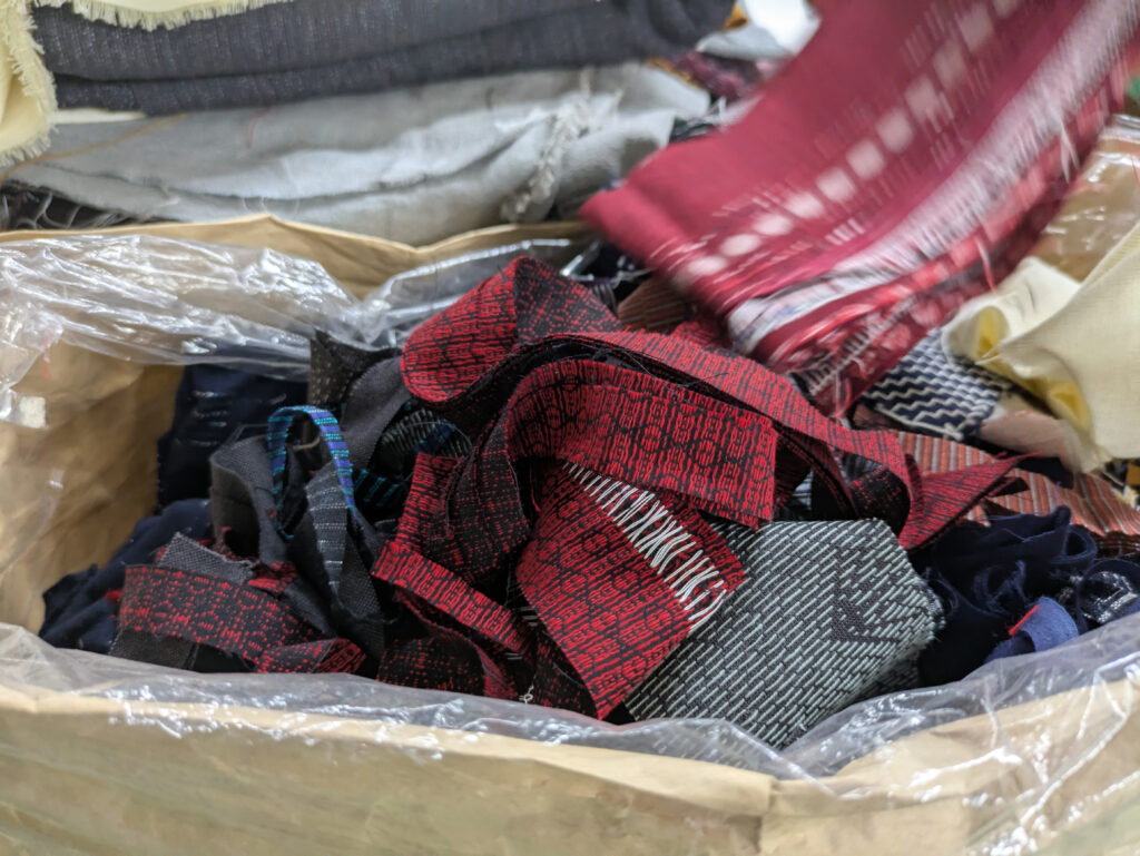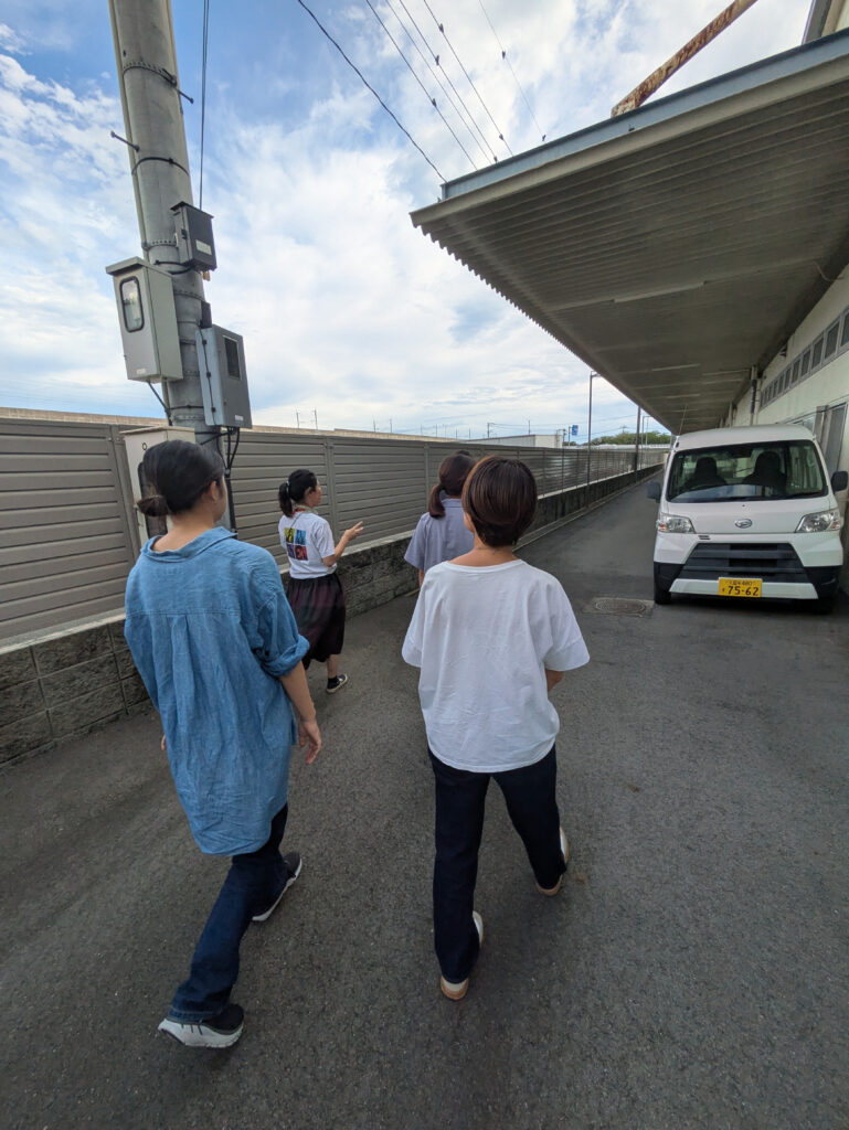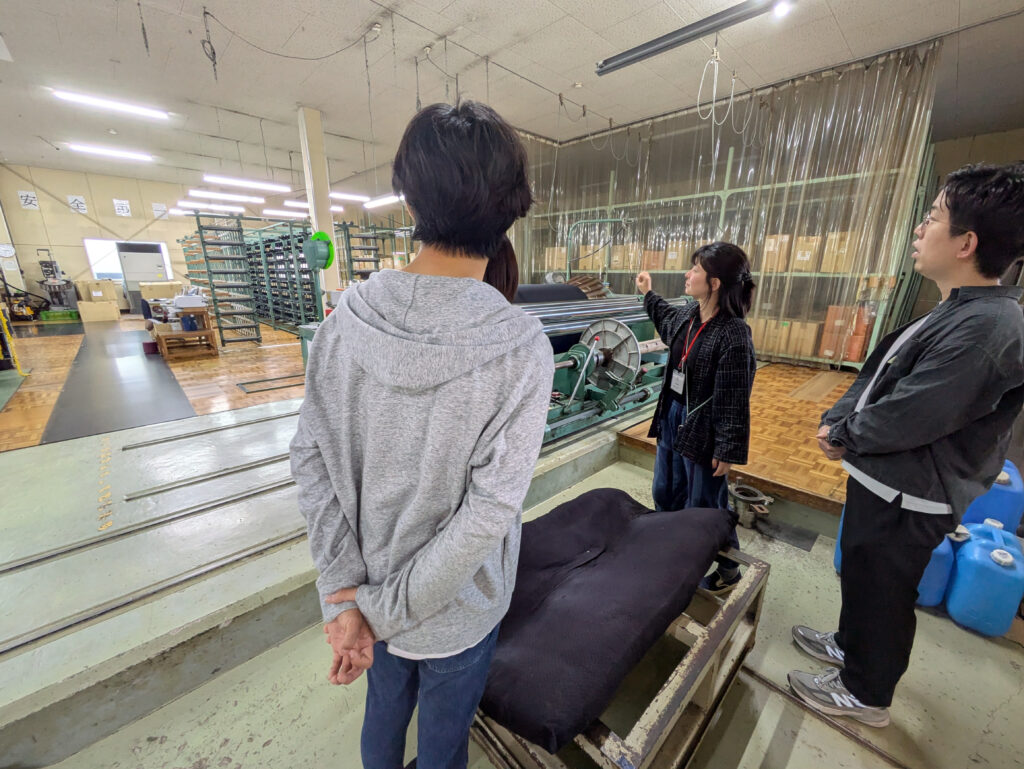 織物の製造過程でどうしても避けられないのが、残糸や端切れの発生です。同社は、SDGsの視点から、残糸のアップサイクル商品「odd glove」を開発し、2022年に第24回福岡デザインアワードにおいて、金賞を受賞しました。そんなSDGsの視点を大切にする同社の吉開 ひとみ社長と営業企画部門の樋口 禎子さんは、今回の小野塚さんと大木さんからの協業の提案を快諾。小野塚さんと大木さんは、まずは工場見学をして同社のものづくりや織物業界の現状をつぶさに見ることにしました。今回のプロジェクトを通して解決すべき社会課題の本質は何なのか。それを、まずは自分の目で見て確かめたいと考えたのです。