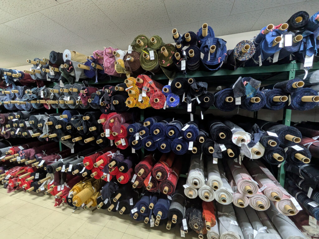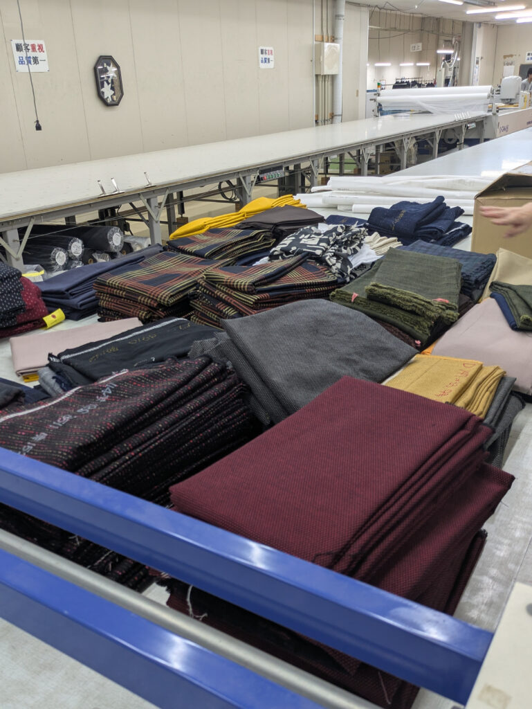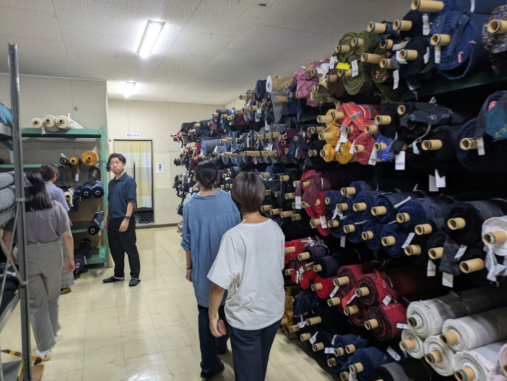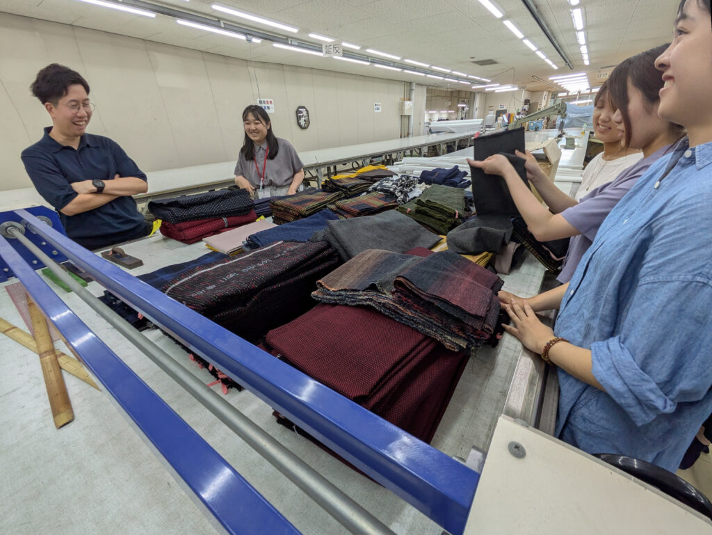 工場見学には、アドバイザーである中間さんと県の担当職員も同行。主要な商品をご紹介いただいたほか、各製造過程を実際に確認しました。他社では品番で管理することが一般的だそうですが、宮田織物のテキスタイルには、その1つ1つに名前が付いています。そんな細部にも、同社の自社商品への愛着を感じます。工場内を回っていて驚かされるのは、熟練の職人さんだけでなく、若手社員や女性社員、外国人社員など多様な人財が協力して1つの商品を作っているということ。同社の従業員平均年齢は約38歳、女性社員比率は約85%、そして外国人社員比率は約20%といいます。