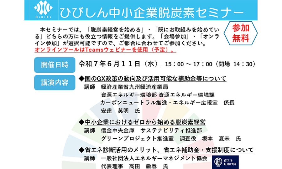 福岡ひびき信用金庫は中小企業のSDGs経営推進を「Face to Face」でサポートしています。SDGs経営・脱炭素経営の啓発に「中小企業向けセミナー」を開催。SDGs経営のスタートに「ひびしんSDGs診断」で「行動宣言書」の作成をお手伝いします。脱炭素経営の第一歩に「CO2排出量見える化ツール」をご案内。さらに取組みを深めたい企業には「エコアクション21実践講座」で認証取得をご支援しています。まずは「ひびしん」にお気軽にご相談ください。