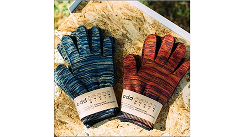 綿入袢天や作務衣、haori等の生地の製織工程(特に整経=せいけい)でどうしても発生する残糸を、久留米のイナバ株式会社様とコラボし、oddシリーズ(お洒落な手袋や靴下、アームカバー)にアップサイクルしています。